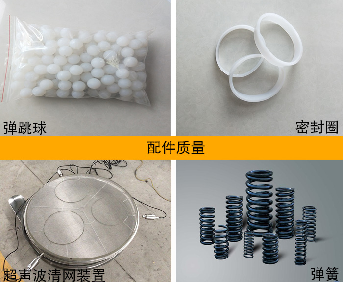 振動(dòng)篩的配件有振動(dòng)電機(jī)、減震彈簧、密封圈、清網(wǎng)裝置等。配件的質(zhì)量也是衡量振動(dòng)篩優(yōu)劣的重要方面。我們以常見(jiàn)的彈跳球清網(wǎng)裝置為例,彈跳球的材質(zhì)可分為橡膠和硅膠兩類(lèi),根據(jù)不同物料選用不同的材質(zhì),一旦使用的配件不是正規(guī)匹配的,在使用過(guò)程中就會(huì)出現(xiàn)清網(wǎng)不理想,對(duì)物料產(chǎn)生二次污染等問(wèn)題。