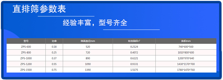 大漢自建廠已經(jīng)經(jīng)過了28個年頭,時間非常長,能夠生產的直排篩的型號一應俱全,可以滿足大多數(shù)客戶的需要,具體的直排篩參數(shù)如上表所示。