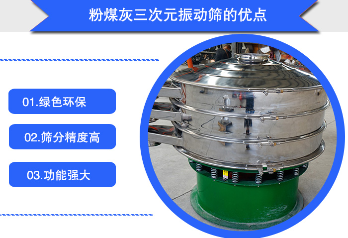 大漢機(jī)械技術(shù)部根據(jù)粉煤灰是粉末狀物料,容易產(chǎn)生揚(yáng)塵,所以推薦使用三次元振動(dòng)篩進(jìn)行篩分。